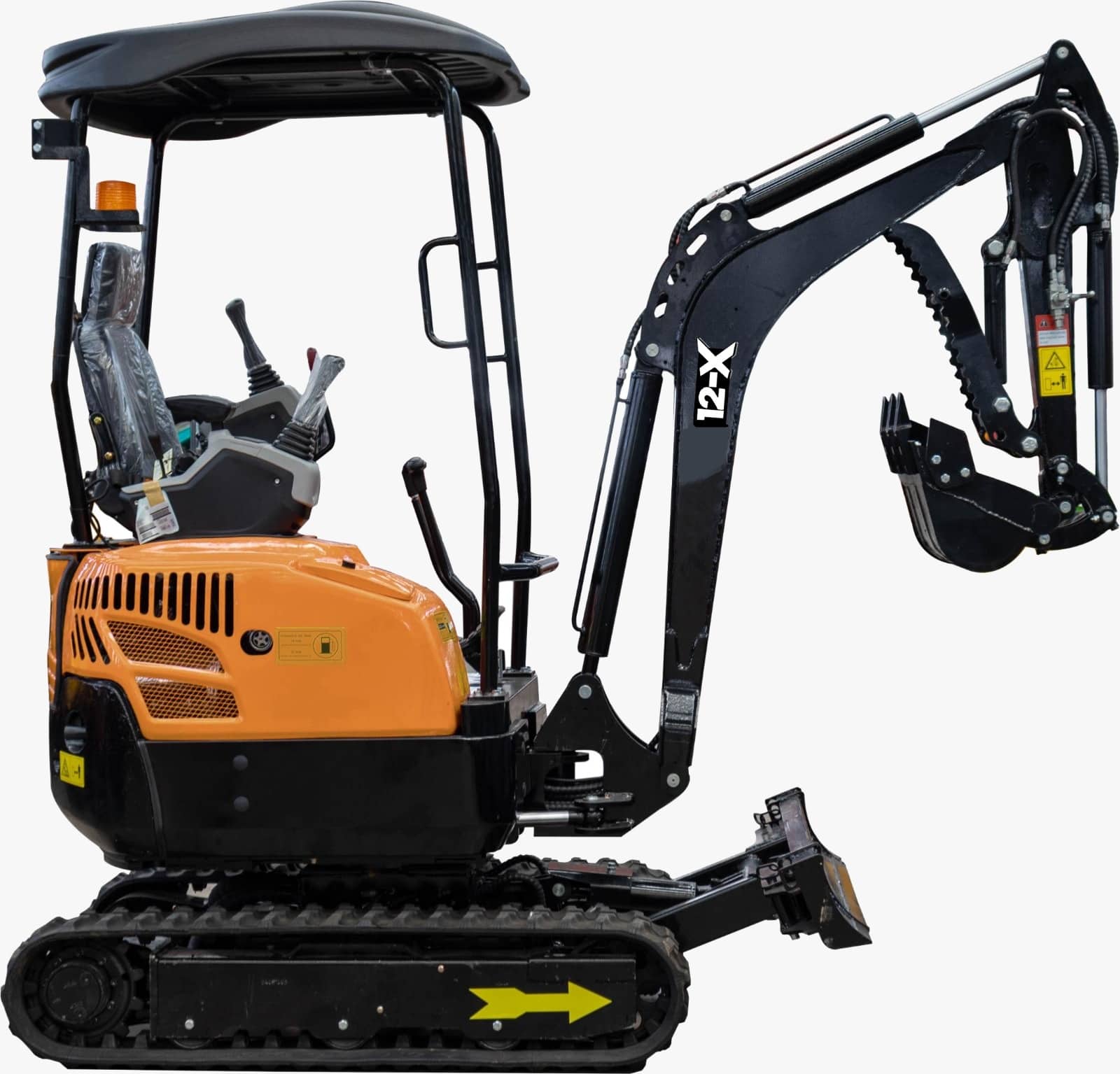 The BULL 12-X mini excavator is built for efficiency in compact spaces, powered by a reliable Kubota D722 3-cylinder diesel engine delivering 15.88 HP. Its Parker hydraulic pump ensures precise, high-performance control, while the offset boom foot provides enhanced maneuverability in tight job sites. Designed with track motor protection, a fixed 42.91-inch chassis, and 7.87-inch wide rubber tracks, the BULL 12-X combines compact design with robust capability. A dual forward speed system allows easy adaptation to any terrain, while a hydraulic thumb and 3 included buckets make this machine ready for a wide range of jobs.